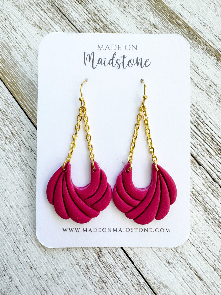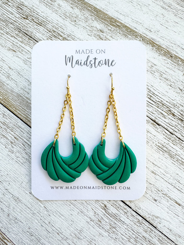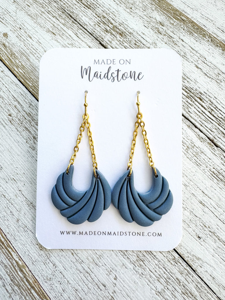 Make a statement with these beautifully handcrafted polymer clay earrings, featuring an elegant sculpted swirl design suspended from delicate gold-tone chains. Each pair is carefully made by hand, giving the earrings their soft, dimensional curves and a smooth matte finish.
