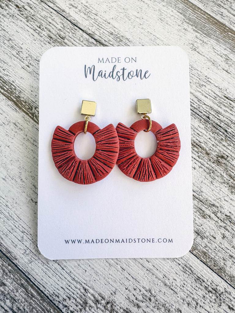 Add a touch of artisanal charm to your look with these handcrafted textured clay earrings. Designed in a warm, earthy rust tone, each earring features a beautifully detailed texture that gives the piece depth, movement, and a distinctly handcrafted feel.