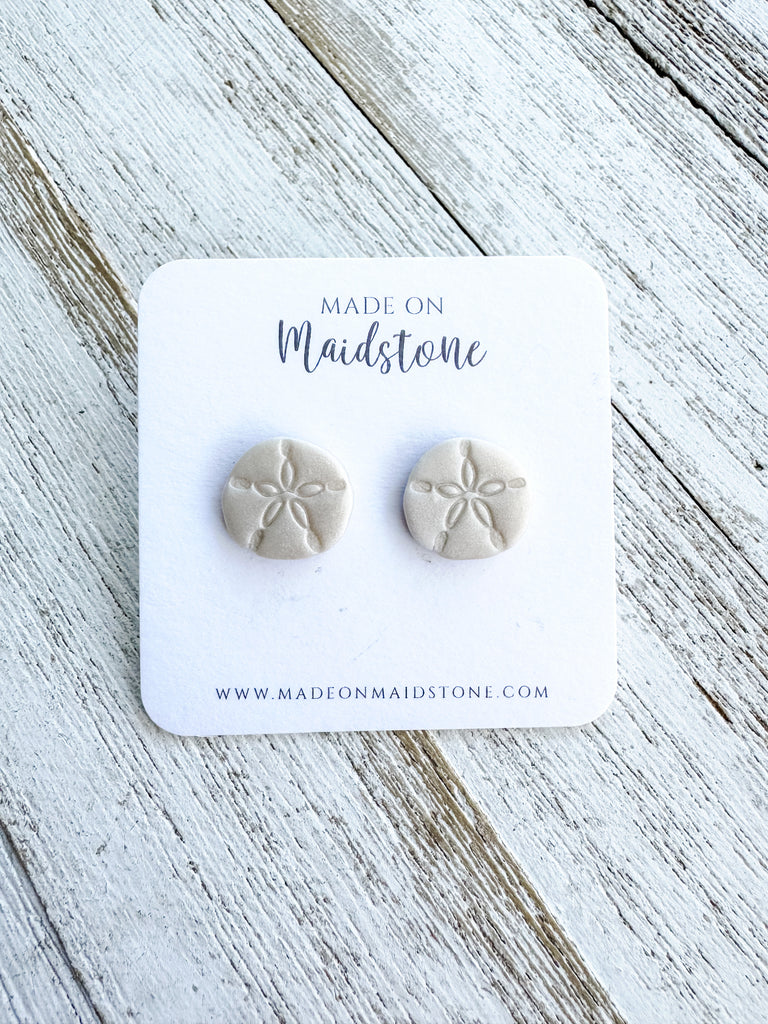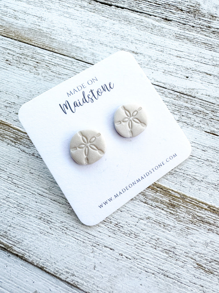 Expertly crafted from polymer clay, our Sand Dollar Studs have a neutral color with a subtle shimmer. These earrings will add a touch of natural beauty to any outfit.