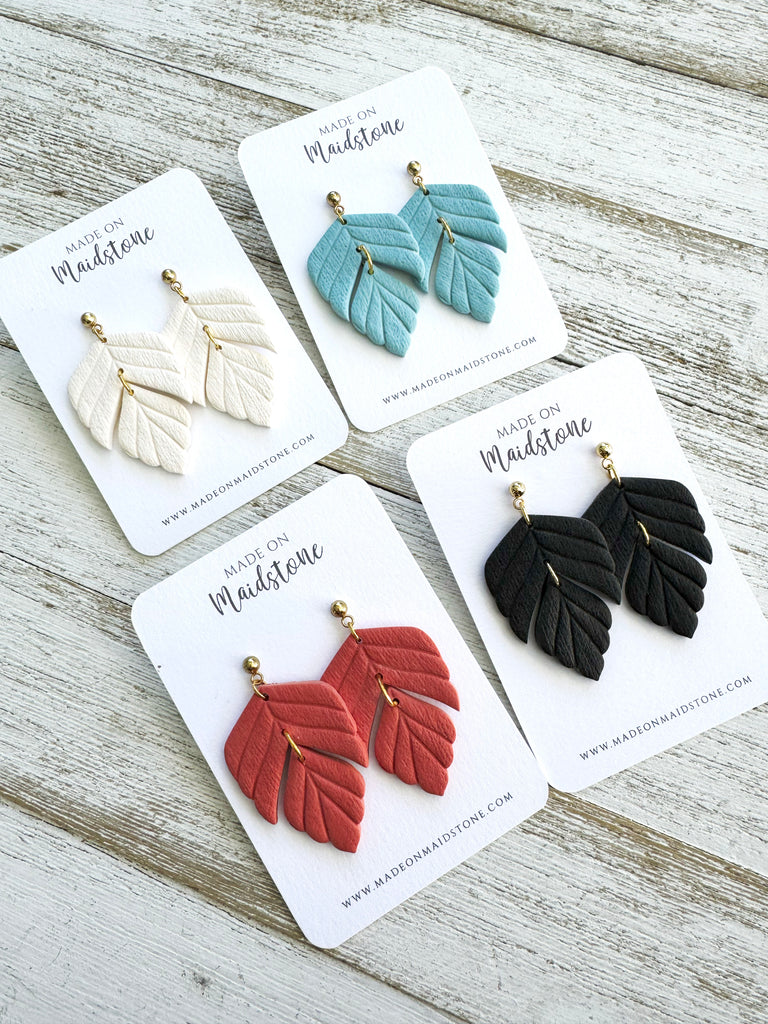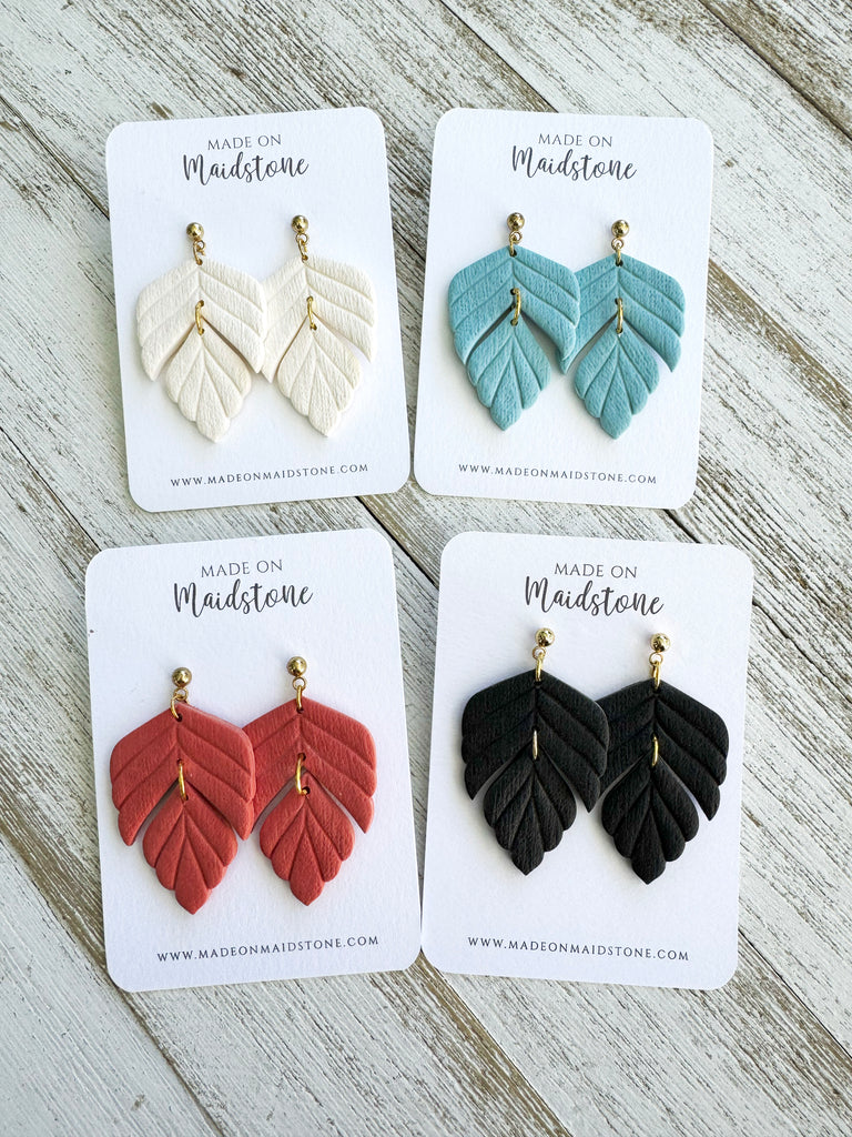 The Vivian Earrings feature a delicate petal shape design in vibrant shades of ivory, sky, or tangerine. Upgrade your jewelry collection with these versatile and stylish statement pieces.