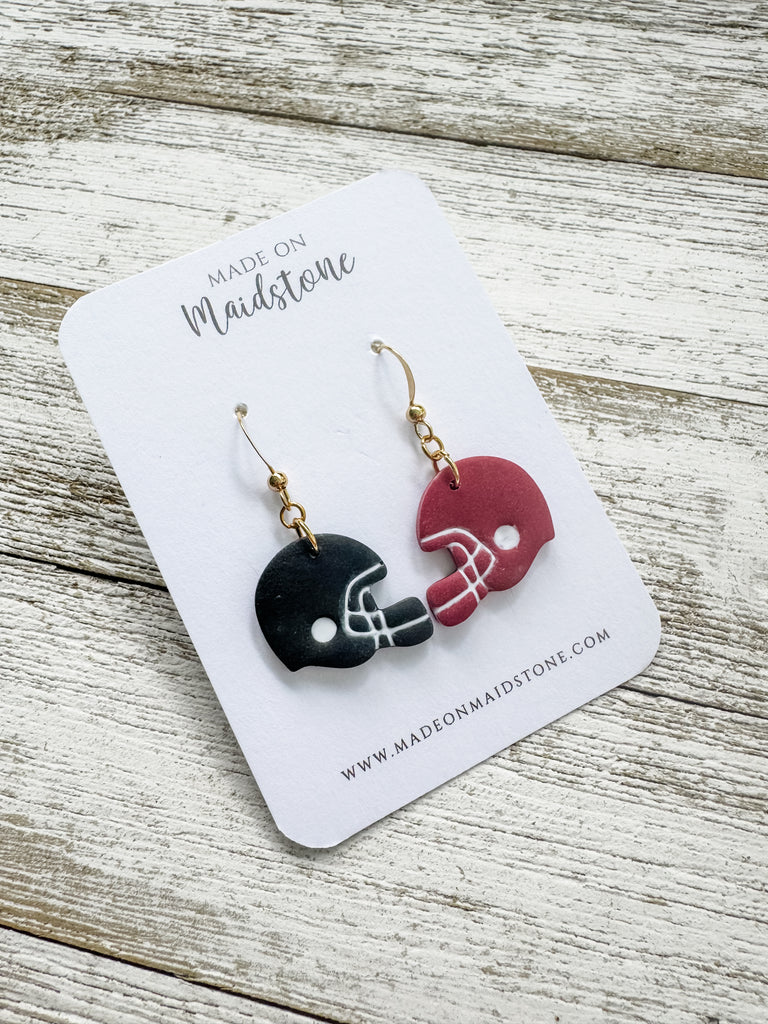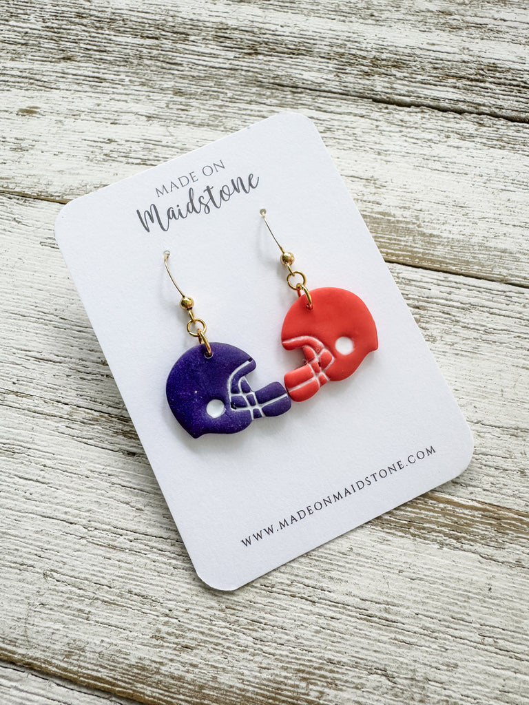 Score major style points with these playful handcrafted earrings! Featuring football helmets in Clemson or Carolina's team colors, these lightweight earrings are perfect for game day, tailgate parties, or showing your love for football year-round. Handcrafted from polymer clay 1.75" long Gold plated hooks